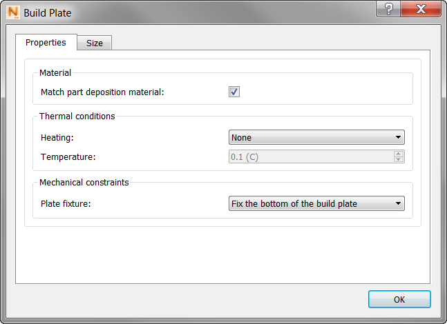 Set the build plate properties and dimensions in the Build Plate dialog.