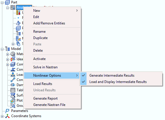- Load and Display Intermediate Results: This option works in conjunction with Generate Intermediate Results and thus, is only available when that option is checked. The incremental results are automatically loaded into the tree under Subcases and can be viewed until the next increment has been solved. This is shown in the example below.