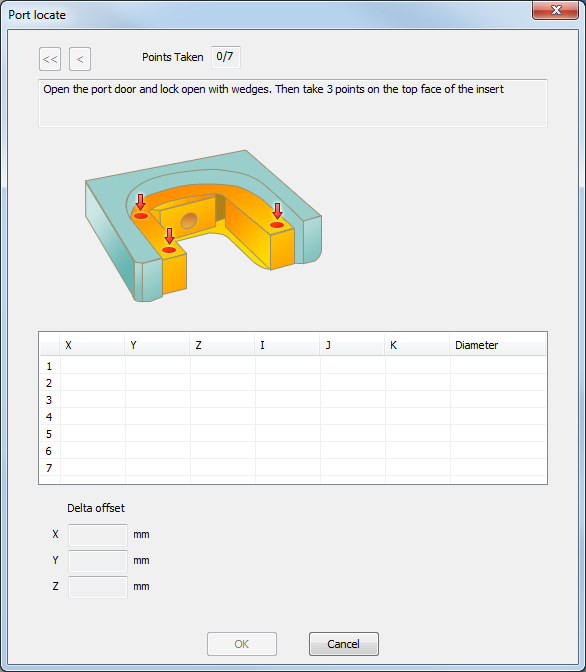 When you have taken all seven points, the dialog displays Locate was successful to indicate the port, or insert, has been located within the rack. It also displays the Delta Offset from the original calculated position.