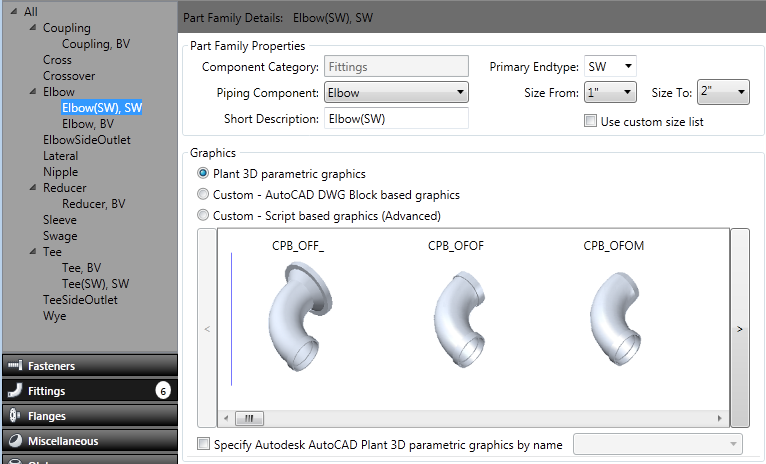 Select a component category (for example: Fittings) and type (for example: Elbow) in the left pane to display part family details in the right pane.
