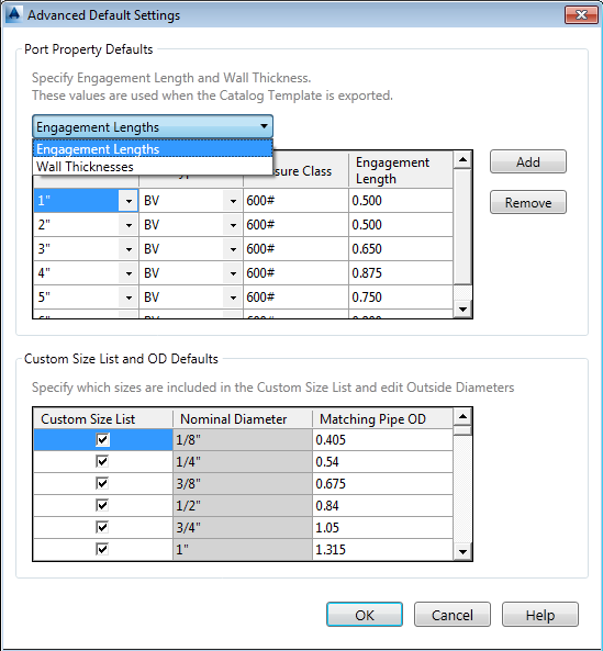 Sets advanced defaults such as wall thickness, engagement length, and outside diameter. You can also specify a custom size list.