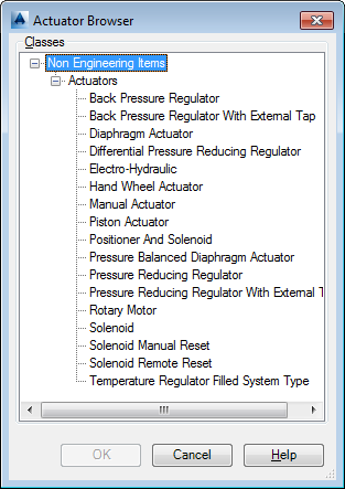 Displays a list of actuators you can select to convert a hand valve to a control valve. Click an item in the list to select it.