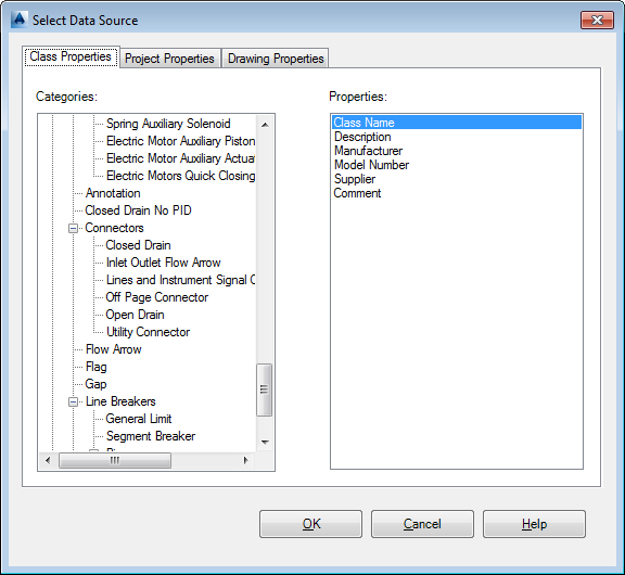 The Select Data Source dialog box displays three tabs that allow you to select a property as a source for the acquired property value. You can choose from a class, project, or drawing property.