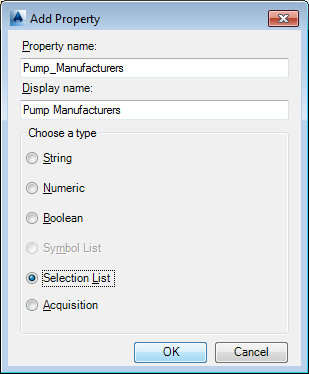 - Under Property Name, enter a name for the new property (for example: Pump_Manufacturers). The name cannot contain any spaces.