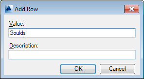 - In the Add Row dialog box, enter the new value (for example: Goulds) and a description of the value, if necessary.