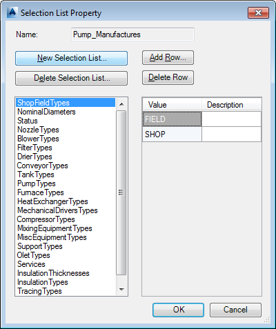 Use selection lists to enforce standard sizes for items such as pipe specs, pipe sizes, and instrument types, or when you want designers to choose from a predefined set of options.