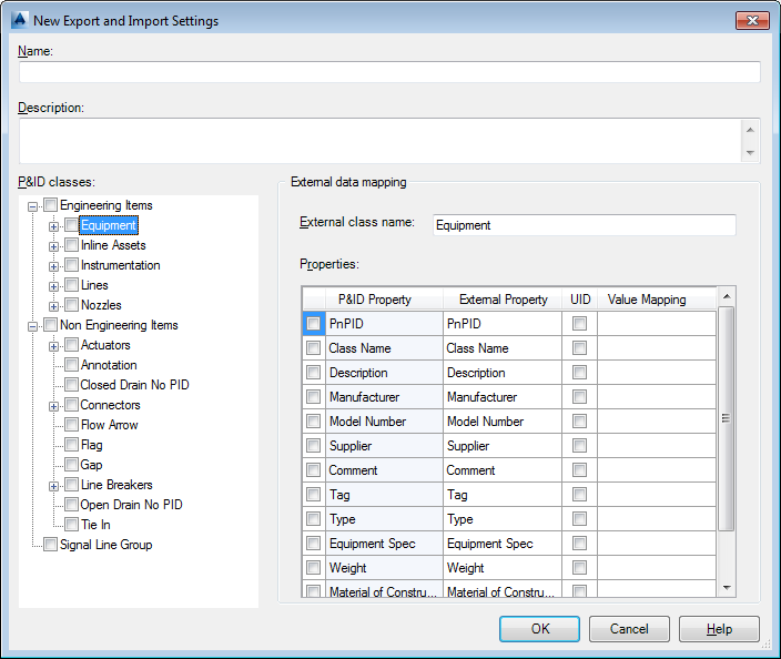 Select P&ID classes to populate fields in the External Data Mapping section.