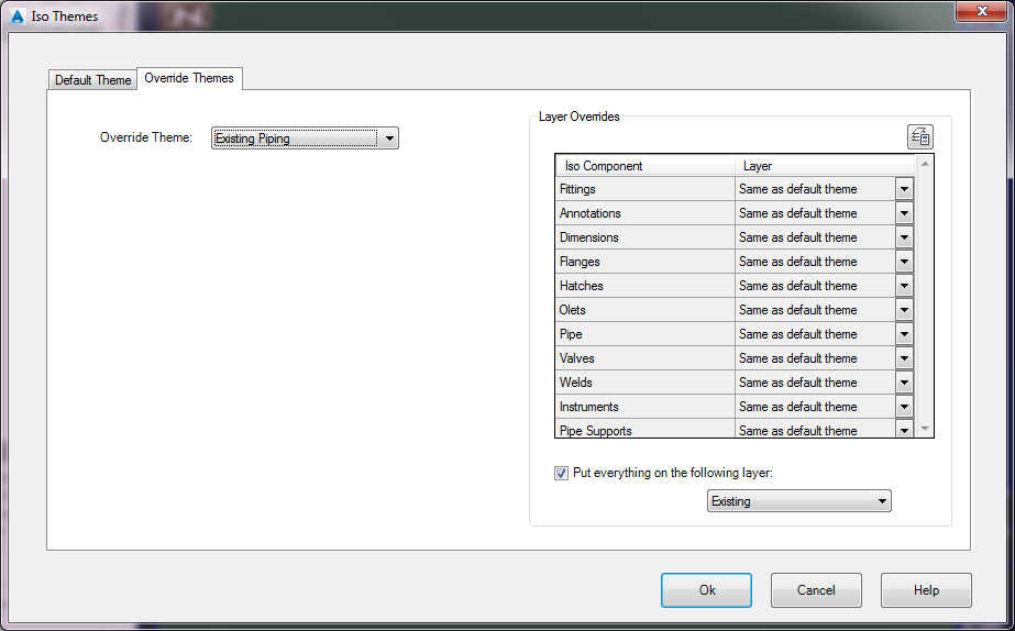 Specifies the layer on which each iso component appears. By default, all layers are set to Same As Default Theme. The component list includes fittings, flanges, hatch, insulation, instruments, pipe, olets, and valves. Global components, such as tables, are excluded.