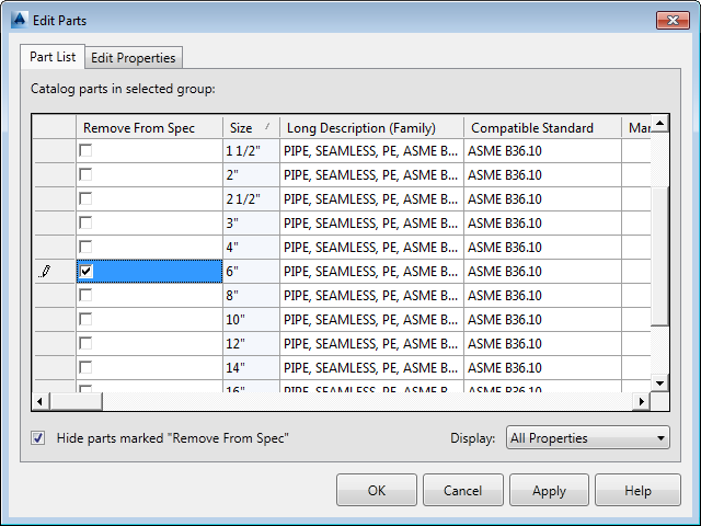 - In the Spec Editor, on the Spec Sheet pane, click a part (for example: PIPE, PE, ASME B36.10).
