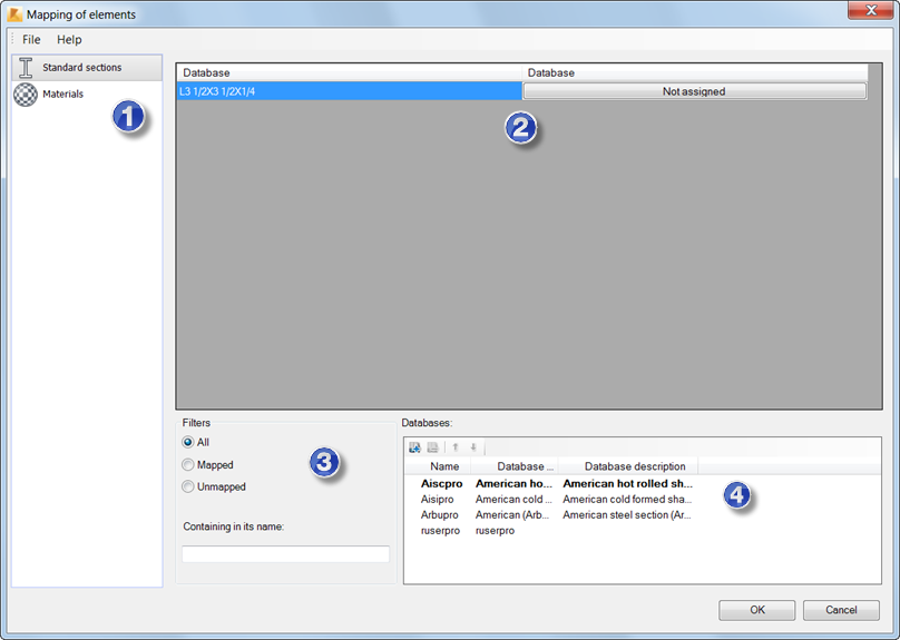 Use Mapping of elements dialog to manually assign materials and sections from Advance Steel databases to materials and sections in Robot databases.