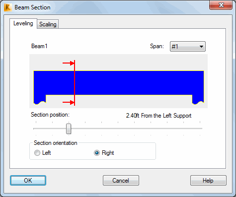 On the Levelling tab in the Beam Section dialog, you can select the cross section and the Span of a beam displayed on the working drawing.