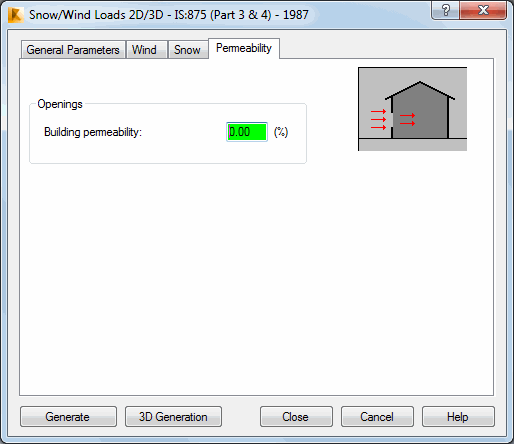 Opening the Snow/Wind Load dialog and clicking the Permeability tab displays the following dialog.