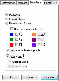 - Diagrams for linear supports. When selected, diagrams are displayed for supports; otherwise, only nodal forces are displayed. After Diagrams for linear supports is selected, the Average value and Integral value options can be selected.
