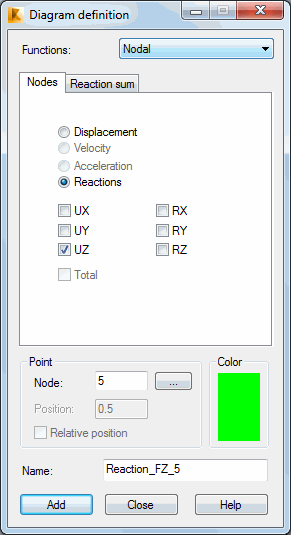 The Diagram definition dialog defines the diagrams of the quantities calculated during advanced analyses (non-linear, time history, and PushOver analyses). The dialog opens after clicking Add or Modify in the Advanced analysis dialog.