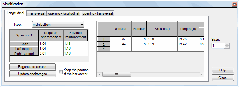 In order to start the reinforcement modification, the type of the reinforcement to be changed should be indicated (it may be done in the reinforcement table or in the graphic viewer) and the reinforcement parameters should be modified (e.g. a bar diameter, a hook length and angle etc.).