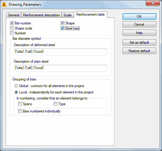 While grouping, the following bar properties are used: steel type, diameter, geometry and shape code. If all these properties are identical for several bars, they can belong to one group.