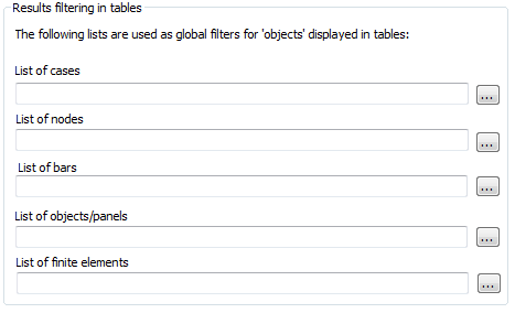 Note: If the fields located on this tab are empty, calculations will be performed for all of the load cases, nodes, bars, panels, objects and finite elements defined in a structure.