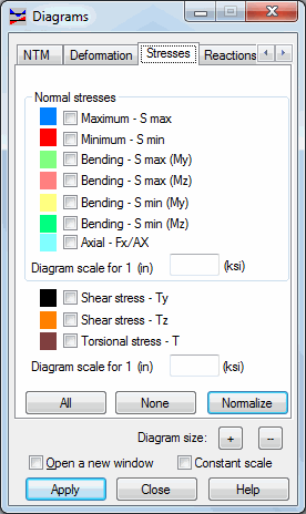 After the Stresses tab is selected in the Diagrams for Bars dialog, the following displays.