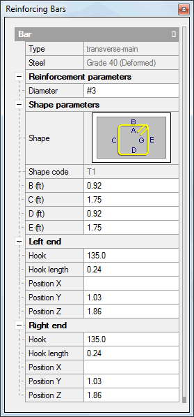If no reinforcing bar has been selected in the graphical viewer or the table of reinforcing bars, the dialog box will remain empty. If the user selects a reinforcing bar, the dialog box will consist of the three tabs:
