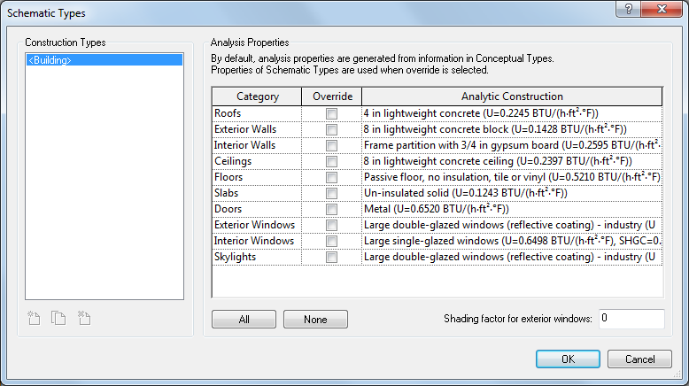 When you next perform energy analysis, thermal properties for the specified schematic types (analytic constructions) are used for those element categories.