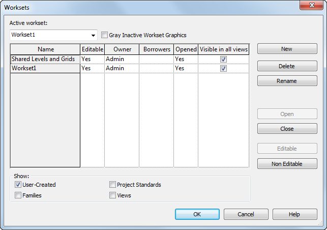 The following image shows the Worksets dialog, with the two default user-created worksets, Shared Levels and Grids and Workset1.