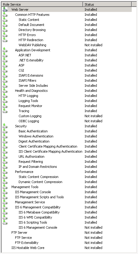 - Scroll down to Role Services, and verify that the following role services are installed: