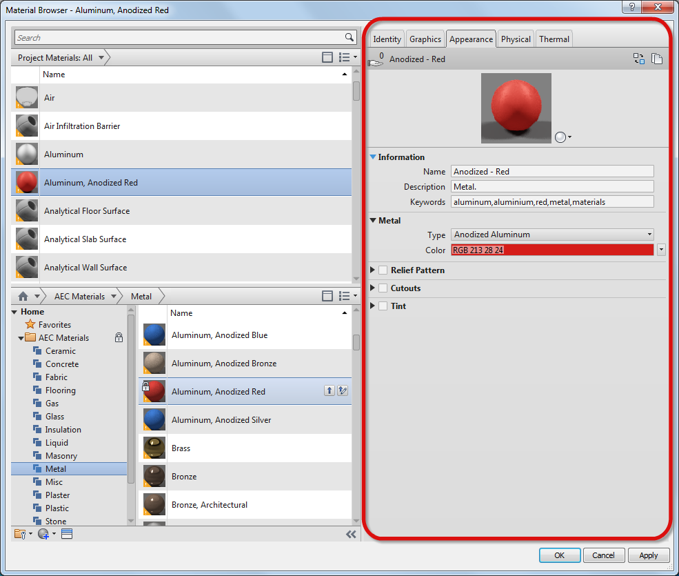 In the Material Browser, this information displays on the Identity, Graphics, and Appearance tabs of the Material Editor panel.