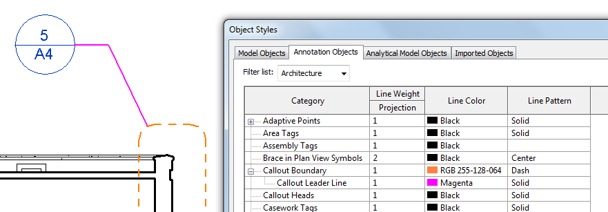You can control the line weight, color, and the pattern used for callout bubbles and leader lines. The settings that you specify here apply to all callouts in the project.