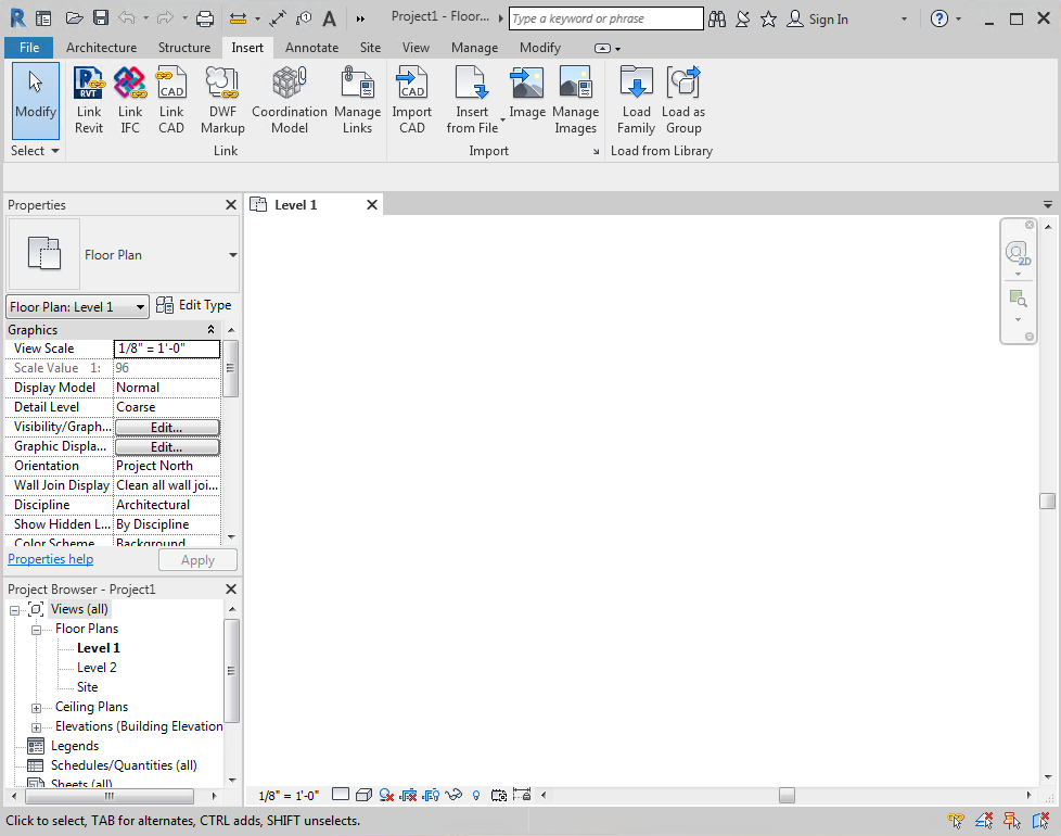 The drawing area displays views (and sheets and schedules) of the current model. Each time you open a view in a model, the view displays in the drawing area.