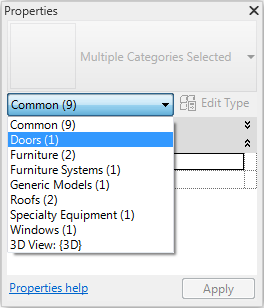 Immediately below the Type Selector is a filter that identifies the category of the elements a tool will place, or the category and number of elements selected in the drawing area. If multiple categories or types are selected, only the instance properties common to all display on the palette. When multiple categories are selected, use the filter’s drop-down to view only the properties for a specific category or for the view itself. Selecting a specific category does not affect the overall selection set.