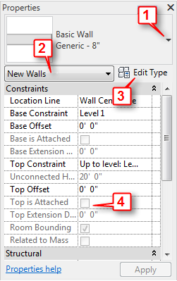 In most cases (see exceptions in note below), the Properties palette displays both user-editable and read-only (shaded) instance properties. A property may be read-only because its value is calculated or assigned automatically by the software, or because it depends on the setting of another property. For example, a wall’s Unconnected Height property is only editable if the value of its Top Constraint property is Unconnected. For specific dependencies, see the instance property descriptions for individual element types.