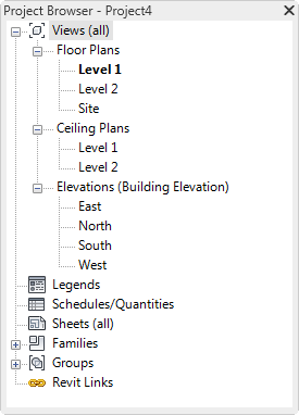 The Project Browser shows a logical hierarchy for all views, schedules, sheets, groups, and other parts of the current project. As you expand and collapse each branch, lower-level items display.