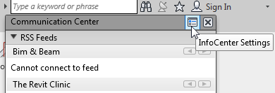 If you have Autodesk Account and Communication Center, you can customize settings such as notification behavior, RSS feeds, and Autodesk Channels in the InfoCenter Settings dialog box. To open this dialog box, click the InfoCenter Settings button at the top of the Autodesk Account, Communication Center, or Favorites menus.