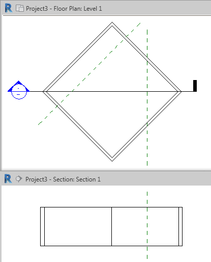 For example, the following floor plan shows 2 reference planes, indicated with dashed green lines. The reference plane on the left intersects the section line at an angle. The reference plane on the right is perpendicular to the section line. Because the angled reference plane is not perpendicular to the section line, the plane does not appear in the resulting section view. However, the perpendicular reference plane does display in the section view.