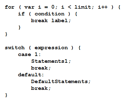 This keyword is used in for loops, do loops, while loops and switch statements. When a break statement is encountered in a loop, control is passed to the statement following the end of the inner-most loop that contains the break statement; unless the break statement is followed by the name of a label, in which case control passes to the statement governed by the label.