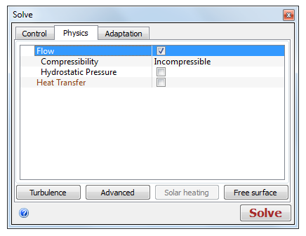 The default settings define an incompressible, turbulent flow analysis, with no heat transfer. The parameters are all engineering in nature, and are listed below: