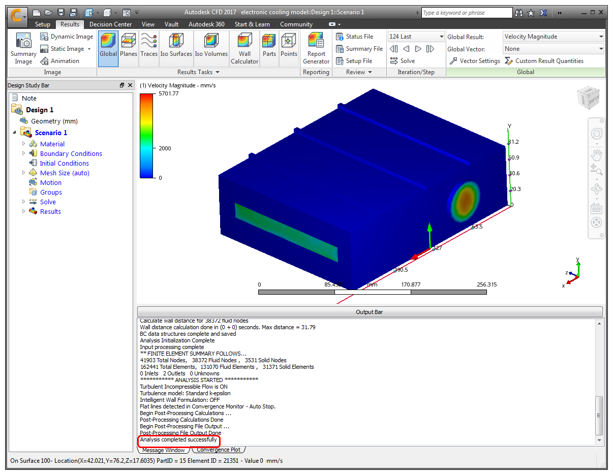 Note: For the first 100 iterations, the Temperature results do not change. Auto Forced Convection runs 100 flow-only iterations before solving for heat transfer. We can do this because the air moves fast enough to eliminate buoyancy effects. If buoyancy was relevant, we would solve flow and heat transfer together.