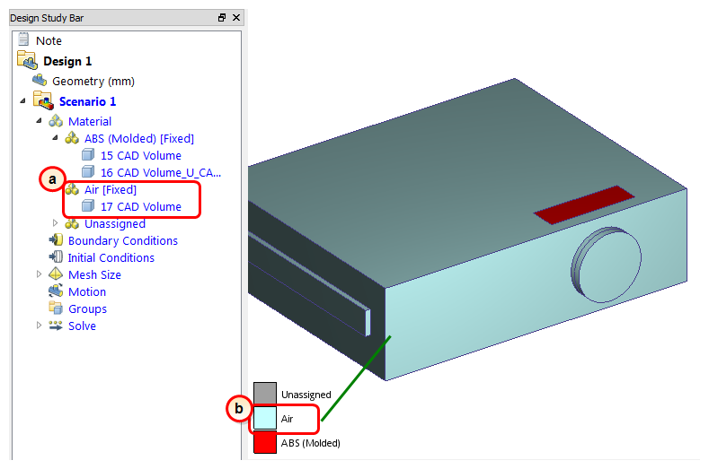 6. To verify that the air material is properly assigned, check the Design Study Bar and the part coloring: