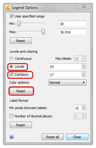 7. To achieve greater resolution between values, click on Levels or Contours or both. Control the levels and contour values in the adjacent fields. Be sure to click Reset when finished.