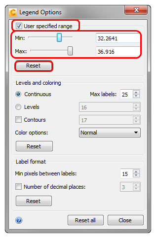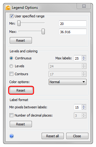 8. Experiment with modifying the label format and number of decimal places. Click Reset all, and click Close to exit the Legend dialog.