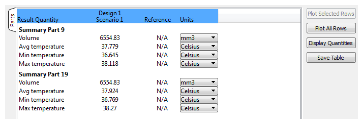Result Parts are ideal for quickly determining the temperature of a selected part. To compare results from several parts, make them Summary Parts, and view their results in the Critical Values tab of the Output bar.
