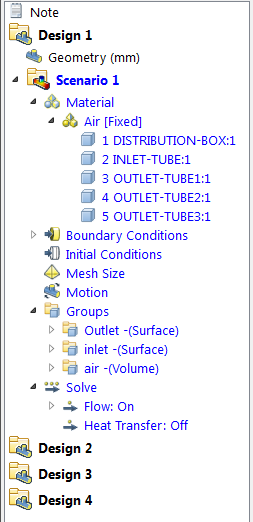 The design study has been created in Autodesk® CFD, and consists of four designs. Each design has a scenario that is fully defined with boundary conditions and materials: