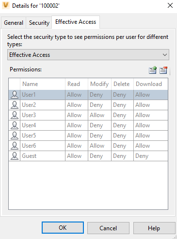 Select a security type to see a user's effective permissions for that security mode. This is primarily useful when both object-based security and state-based security are applied, and the administrator wants to finder a user's effective permissions.