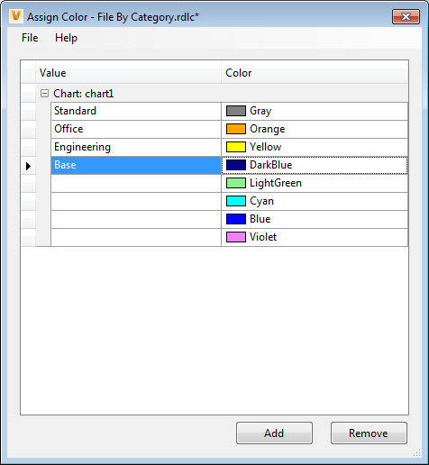 When a report is generated that returns a value for which a color has not yet been assigned, the report control will assign a color to the new value from a predetermined list of colors and write back the report template a name and value pair for the new color. The new value and default color assignment are displayed in the Assign Color dialog where the administrator can update the template by assigning a color to this new value.