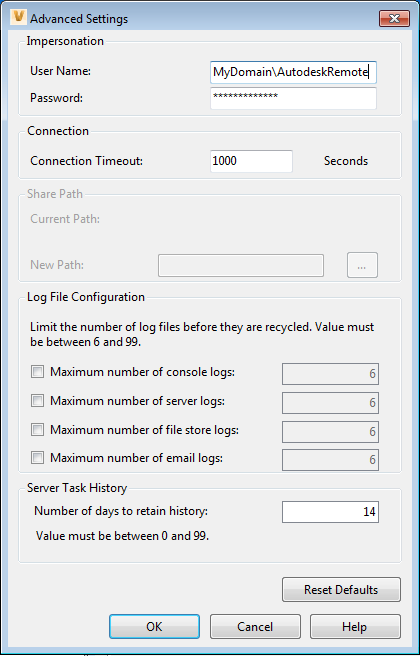 - In the Advanced Settings dialog box, change the User Name to MyDomain\AutodeskRemote, and enter the corresponding password.