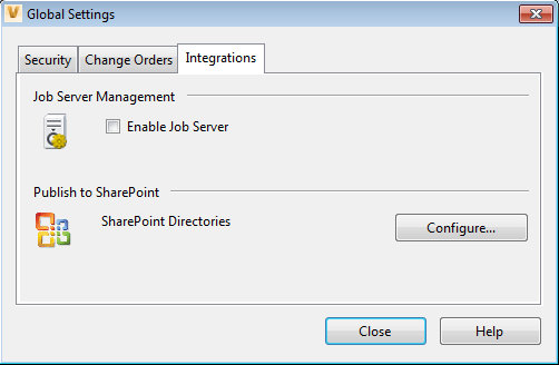 Enable the Job Server and configure settings for publishing to SharePoint directories on the Integrations tab of the Global Settings dialog.