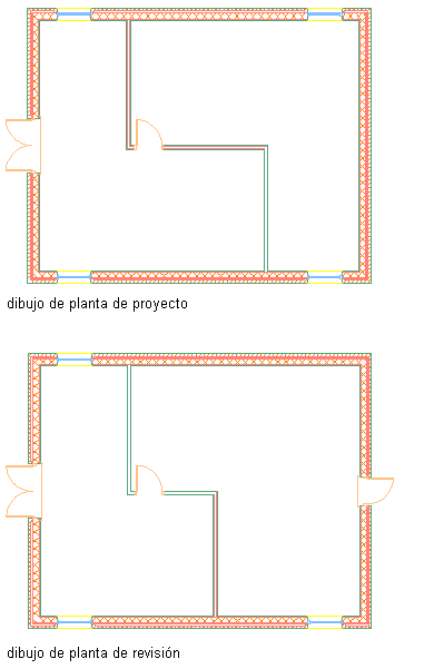 En el ejemplo siguiente, se modifica una planta simple para mostrar la información que incluye la función Comparación de dibujos durante una sesión de comparación. El dibujo de revisión muestra que los cambios en el dibujo de proyecto incluyen mover el segmento de muro vertical interior de la parte inferior a la izquierda, lo cual crea un segmento de muro interior horizontal más corto, agregar una puerta exterior al segmento de muro exterior de la derecha, y eliminar una ventana del segmento de muro exterior de la parte superior.