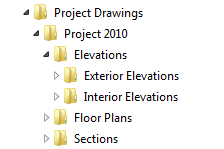 Si no trabaja con un proyecto estructurado de AutoCAD Architecture toolset, organice los dibujos originales en carpetas de proyecto y los dibujos revisados para la revisión en carpetas de revisión. Todos los dibujos de proyecto deben estar en la misma carpeta de nivel superior para proporcionar el contexto adecuado para la comparación. Estas carpetas de origen se especifican para las carpetas de proyecto y revisión cuando se inicia la función Comparación de dibujos. Los dibujos podrían estar organizados de un modo desordenado en planos, alzados y secciones, y tendrían el siguiente aspecto: