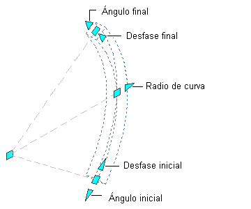 Pinzamientos para ángulos de inicio y fin, radios y desfases inicial y final de una viga o riostra curva