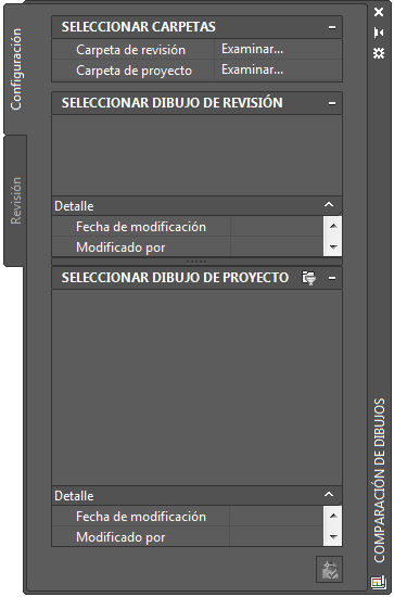 En la ficha Configuración de la paleta Comparación de dibujos se selecciona el contexto que se utilizará para emparejar y analizar los dibujos. En Seleccionar carpetas, la carpeta de revisión contiene los dibujos actualizados o revisados, mientras que la carpeta de proyecto contiene la versión original de los archivos de dibujo. Todos los dibujos de proyecto deben estar en la misma carpeta de nivel superior para proporcionar el contexto adecuado.